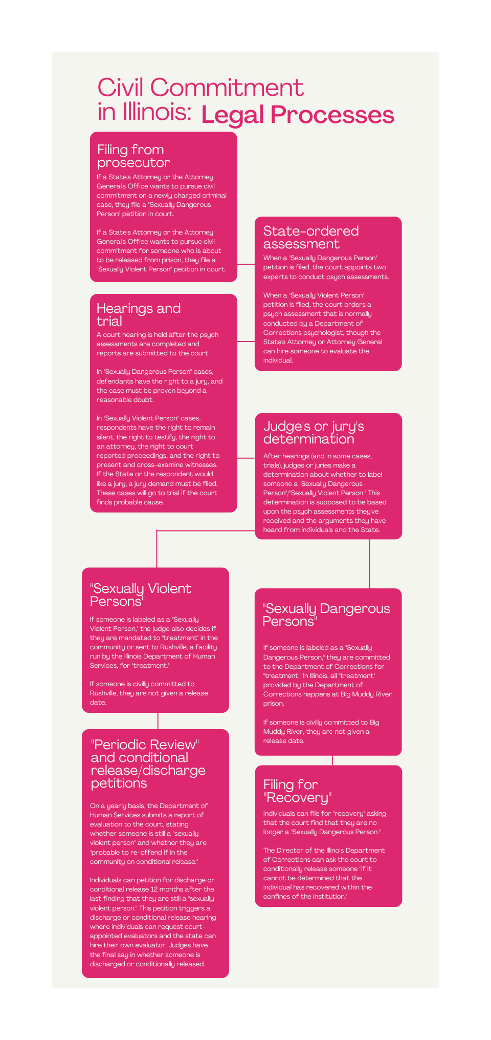 An overview from the Illinois Sex Offender Management Board website explains civil commitment in more detail. In Illinois, civil commitment begins after a prosecutor (from the State’s Attorney’s Office or Attorney General’s Office) requests a psychological evaluation to designate someone a “Sexually Dangerous Person.” After two “experts” assess an individual, there is a hearing in court where the prosecution argues for this label and an individual is able to defend against the label, all based on the reports of these “experts.” After a hearing, a judge in criminal court may decide to label someone a “Sexually Dangerous Person.” Civil commitment involves sending this person to the Illinois Department of Corrections for “sex offender treatment.” Individuals who are civilly committed under this statute are sent to Big Muddy River prison. Although individuals can file for Recovery asking the court to determine that they are no longer a “Sexually Dangerous Person,” the Illinois DOC can also ask the court to conditionally release someone “if it cannot be determined that the defendant has recovered within the confines of the institution.”